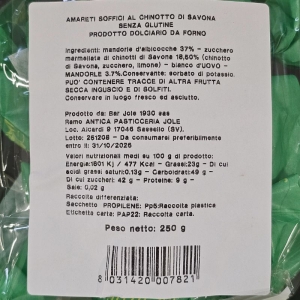 Soft, fragrant, and unmistakably aromatic, the Chinotto di Savona Amaretti by Pasticceria Jole are inspired by the traditional soft amaretti of Sassello, enriched with a unique Ligurian touch. The soft, delicate dough contains 18.50% Chinotto di Savona marmalade, which adds fresh citrus notes and a pleasantly bitter nuance, perfectly balanced by the sweetness of almonds. The result is a refined yet distinctive cookie that surprises with every bite. Perfect on their own, with coffee, or as an elegant end to a meal, these amaretti embody artisanal craftsmanship and one of Liguria’s most iconic flavors.
