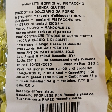 Moelleux et délicatement parfumés, les Amaretti de Sassello à la pistache de la Pasticceria Jole offrent un équilibre subtil de saveurs. La pâte tendre à base d’amandes s’associe à une pâte de pistache issue de pistaches grillées, créant un contraste harmonieux entre la douceur de l’amande et la note plus intense et légèrement salée de la pistache. Un biscuit élégant, parfait seul, avec un café ou en fin de repas.