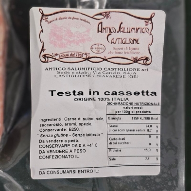 La tête pressée, également appelée soppressata, est une charcuterie traditionnelle de la gastronomie génoise et ligure, étroitement liée à l’ancienne tradition paysanne du territoire.