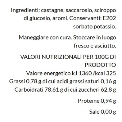 Ogni marrone viene trattato con estrema cura per mantenere la sua integrità e valorizzare l’equilibrio tra dolcezza e delicate note aromatiche. Il risultato è un prodotto di qualità superiore, dalla texture vellutata e dal sapore elegante, ideale da gustare da solo, come fine pasto o in abbinamento a dessert e preparazioni di alta pasticceria.